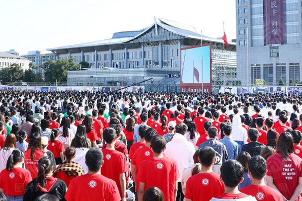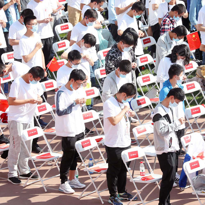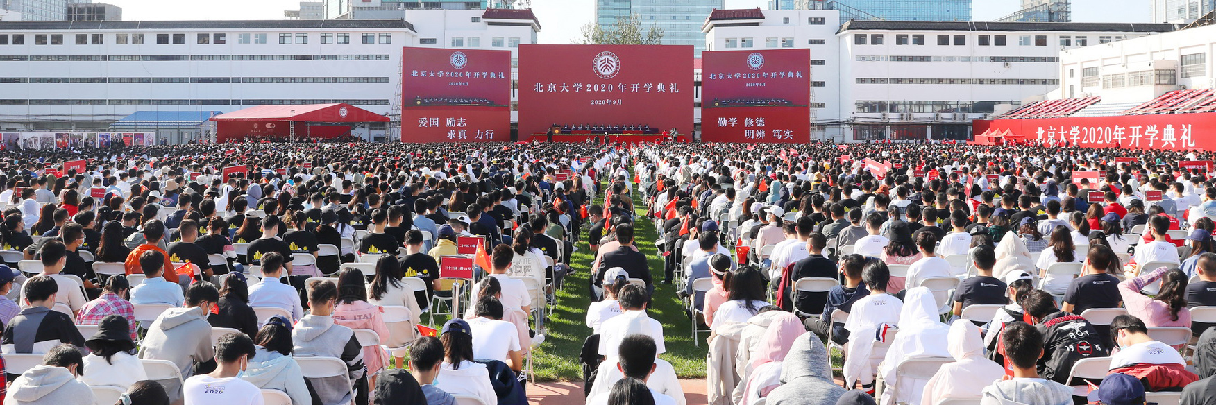 2020级本科生、硕士生、博士生齐聚在五四田径场,一同为燕园注入了新的活力。远处高楼上悬挂的条幅,是国家对于北大人最殷切的希望。